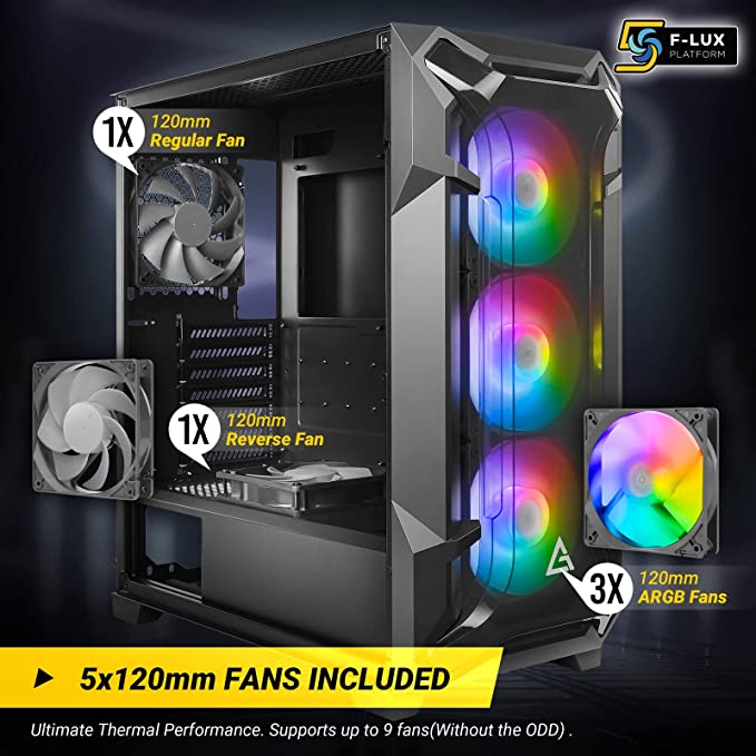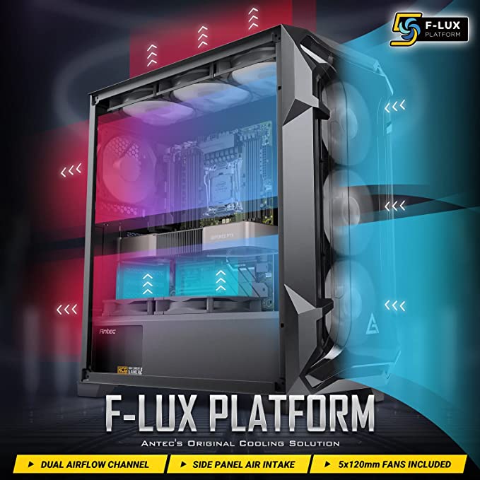 Antec DF600 Flux Mid-Tower ATX Computer Cabinet/Gaming Case | Built in Fan Controller | 4 mm Tempered Glass Side Panel with 3 x 120mm ARGB Fans + 2 x 120 mm Black Fans